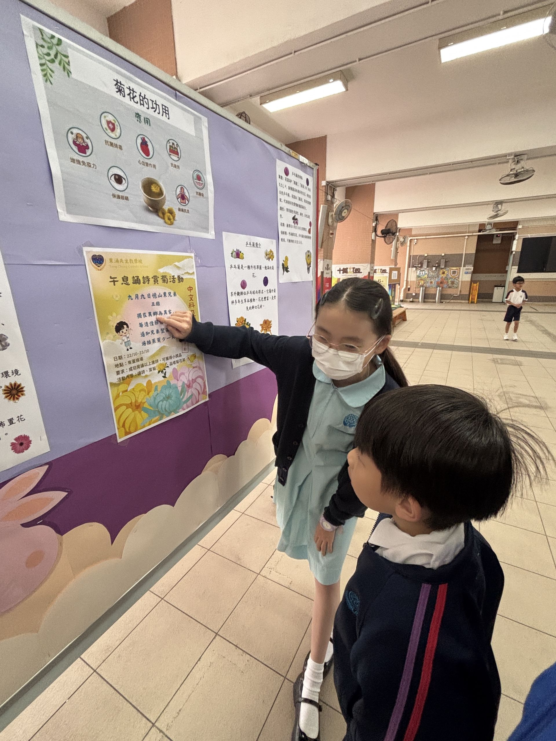 中文科及德公組聯合於10月22日及23日兩天午飯後舉行重陽節活動,並得到家長到場協助,同學踴躍參與是次活動。同學們誦讀唐代詩人王維的作品—《九月九日憶山東兄弟》,並且一邊品嚐清甜的菊花茶,一邊觀賞秀麗的菊花,一起迎接重陽節的來臨。