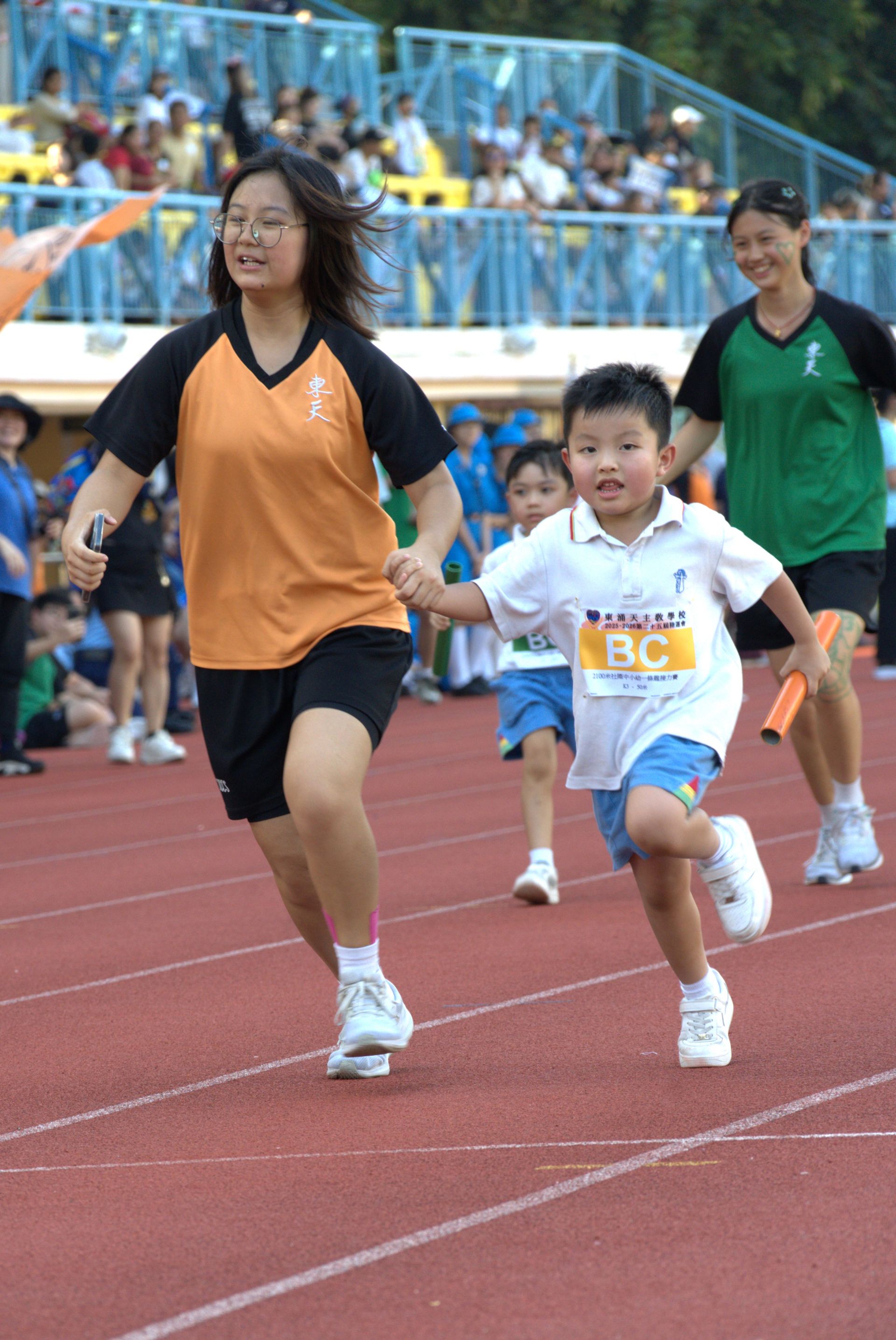 每年運動會的亮點之一,是由東涌天主教幼稚園、小學及中學學生與校友共同參與的「一條龍接力賽」。比賽從最年幼的小朋友出發,一棒接一棒,傳遞至昔日的畢業校友,象徵教育的延續與信念的傳承。接力棒在不同年級、不同世代之間交替傳遞,寓意着「薪火相傳、永續發光」的教育精神,也充分展現了東天人在愛與使命中的緊密連結。